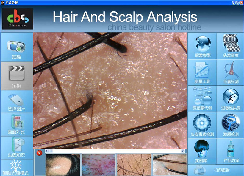 8、特别提示:该型号(CBS-603)的分析系统和CBS-606、CBS-607、CBS-608、CBS-609的分析系统界面基本一致,但是该型号(CBS-603)分析系统里面的密度“检测模块”及该模块下属的“发根密度”、“移植数量”、“提取范围”不可用;